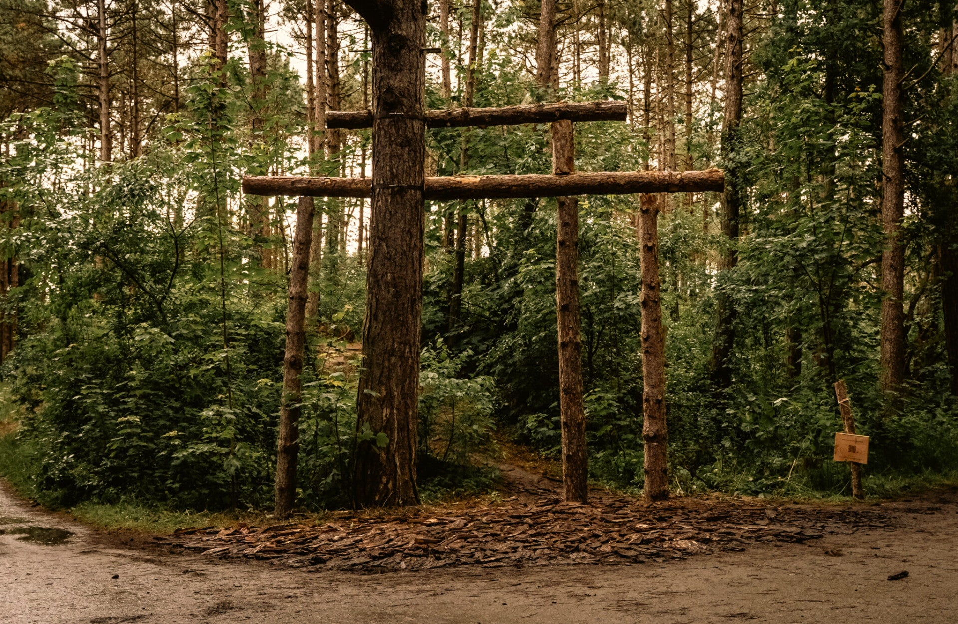 Bij aankomst wordt de bezoeker welkom geheten bij twee enorme houten pilaren. Door de QR te scannen wordt de wandeling naar de installatie in het bos vanaf hier vergezeld met audiotour. Hoe communiceren bomen met elkaar en met andere organismes? Hoe neemt het bos waar? Op welke manier denkt het bos?